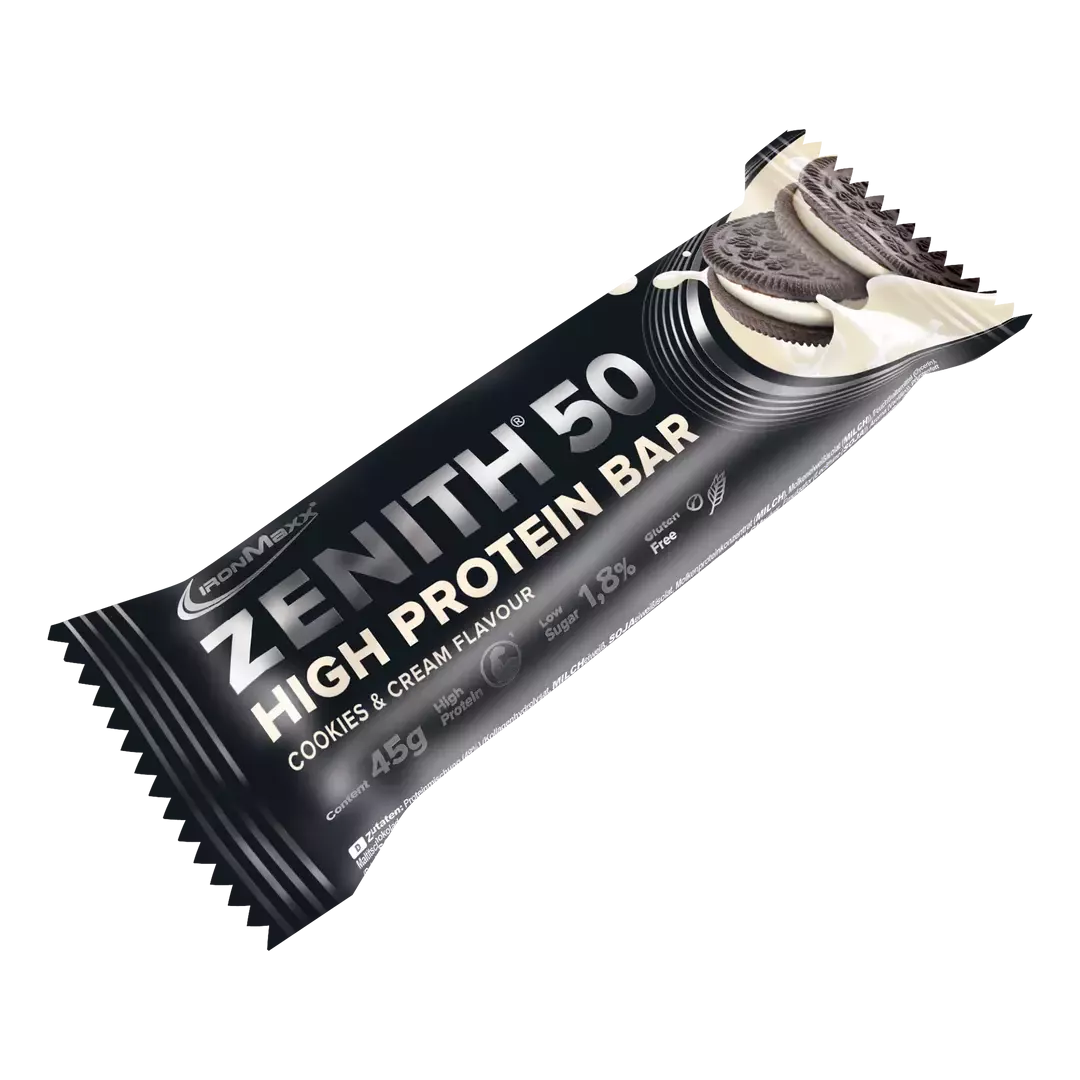 „IronMaxx® ZENITH® 50“ didelio baltymų kiekio batonėlyje yra 23 g baltymų ir daugiausia 1,1 g cukraus. Dėl išmanaus pieno, išrūgų ir sojų baltymų mišinio jis idealiai tinka raumenų auginimui, raumenų apibrėžimui ir subalansuotai mitybai. Nesvarbu, ar vartojamas po treniruotės, ar kaip užkandis tarp jų – šis baltymų batonėlis yra kreminės konsistencijos, traškus ir be glitimo, todėl pasižymi maksimaliu skoniu be jokių kompromisų.